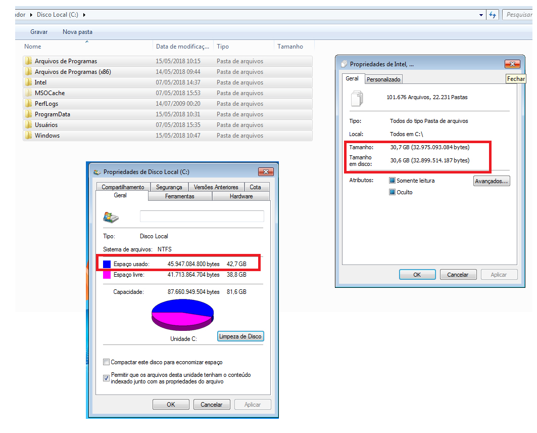 Unidade C: ocupando mais espaço do que o mostrado em arquivos.